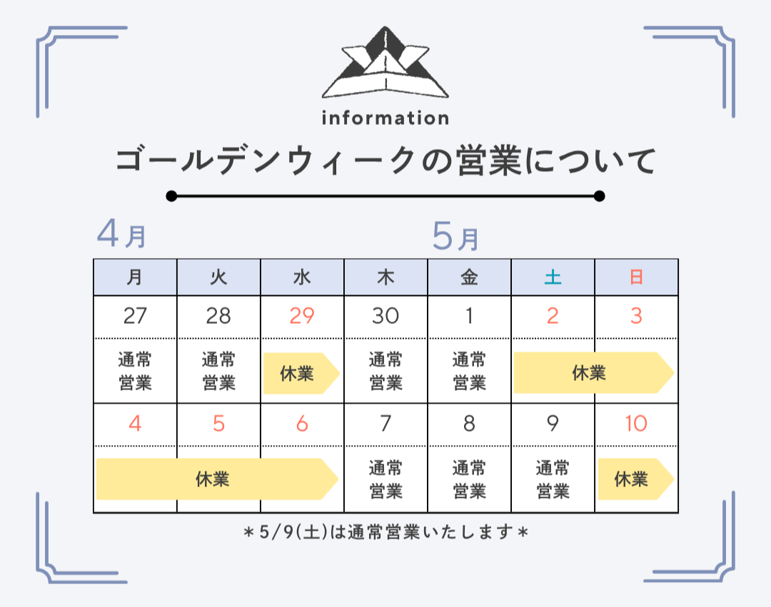 ゴールデンウィーク期間中の営業日につきまして、下記の通りご案内申し上げます。